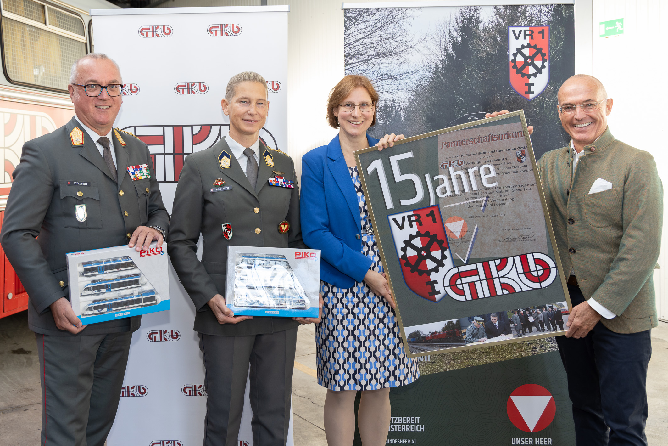 Anschließend feierte man gemeinsam 15 Jahre Partnerschaft zwischen dem Versorgungsregiment 1 des Österreichischen Bundesheeres und der Graz-Köflacher Bahn und Busbetrieb GmbH. Eingerahmt von einem Quartett der Militärmusik Steiermark lobten Landesmilitärkommandant Generalleutnant Mag. Heinz Zöllner und Regimentskommandantin Oberst Mag. Jasmine Krutzler die gelebte Partnerschaft mit dem Unternehmen. Die Geschäftsführung der GKB dankte dem VR1 und dem Bundesheer für die großartige Zusammenarbeit.