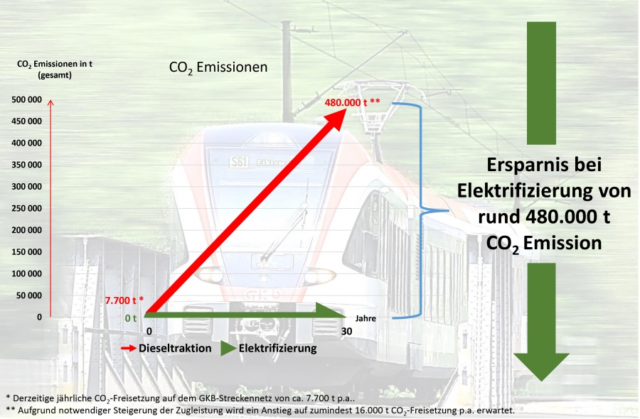 Im Großraum Graz und in den von der GKB bedienten Regionen West- und Südweststeiermark sollen zukünftig die Zielvorgaben der S-Bahn Steiermark umgesetzt werden. Auf den Hauptstrecken in der Region soll jeweils ein 30-Minuten-Takt und im Nahbereich von Graz eine Fahrplanverdichtung auf einen 15-Minuten-Takt erreicht werden, außerdem soll es bedarfsorientierte Verdichtungen geben. Dieses erweiterte Mobilitätsangebot wäre eine bequeme und umweltfreundliche Alternative zum Individualverkehr. Der Betrieb von Zügen mit Diesel verursacht aber eine zu vermeidende Freisetzung von CO2 und anderen unerwünschten Emissionen. Auf den GKB-Strecken werden bereits jetzt jährlich ungefähr 1,6 Mio. Zugkilometer erbracht, dadurch entstehen aktuell ungefähr 7.700 Tonnen CO2. In verschiedenen Prognosen und Planungen werden mittelfristig Steigerungen der Zugleistungen um bis zu 150 Prozent, also das 2½-fache des heutigen Verkehrs zur Bedeckung der Nachfrage vorhergesagt. Diese massive Verbesserung des Mobilitätsangebotes würde allerdings auch eine Erhöhung des fossil bedingten CO2-Ausstoßes auf geschätzte 16.000 Tonnen pro Jahr bedeuten. Dies kann aber durch eine strategisch und planvoll umgesetzte Elektrifizierung des gesamten GKB-Netzes vermieden werden. Auf 30 Jahre gerechnet entsteht somit ein geschätztes Einsparungspotenzial von rund 480.000 Tonnen CO2-Emissionen.